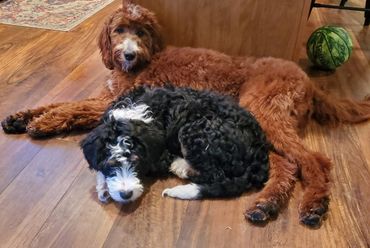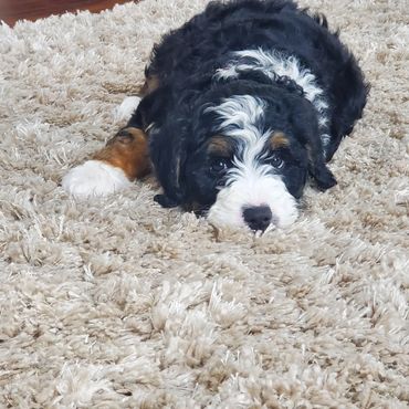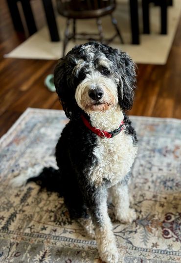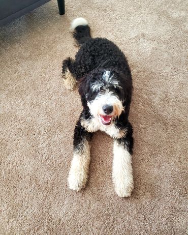 The Bernedoodle dog is a cross between a Bernese Mountain Dog and Poodle. Our Stella is a 1st generation Bernedoodle. She weighs 55 pounds and is a big teddy bear. She is bred with a pure-bred Poodle, resulting in F1b Bernedoodles. This means that her puppies will be 75% Poodle and 25% Bernese Mountain Dog.