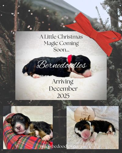 Stella’s sweet Bernedoodle puppies are expected to arrive just in time for Christmas! This litter will include traditional tris, part tris, and phantoms, with coats ranging from wavy to curly.